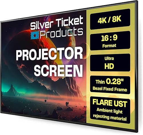 The Silver Ticket Products S7-16992-FLARE 92″ wall-mount fixed-frame ALR screen [Silver Ticket Products link] [at Amazon] rejects up to 75% of ceiling ambient light, features a gain of 0.55, and has a 140° viewing angle.